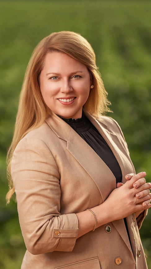 professional woman in modern beige suit standing in a field with sunlight for a professional headshot