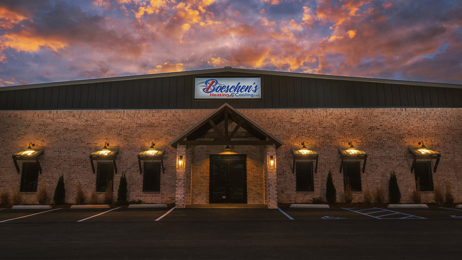 commercially photographed building, boeschen's heating and cooling, with building lights glowing with a sunset visible above and behind building
